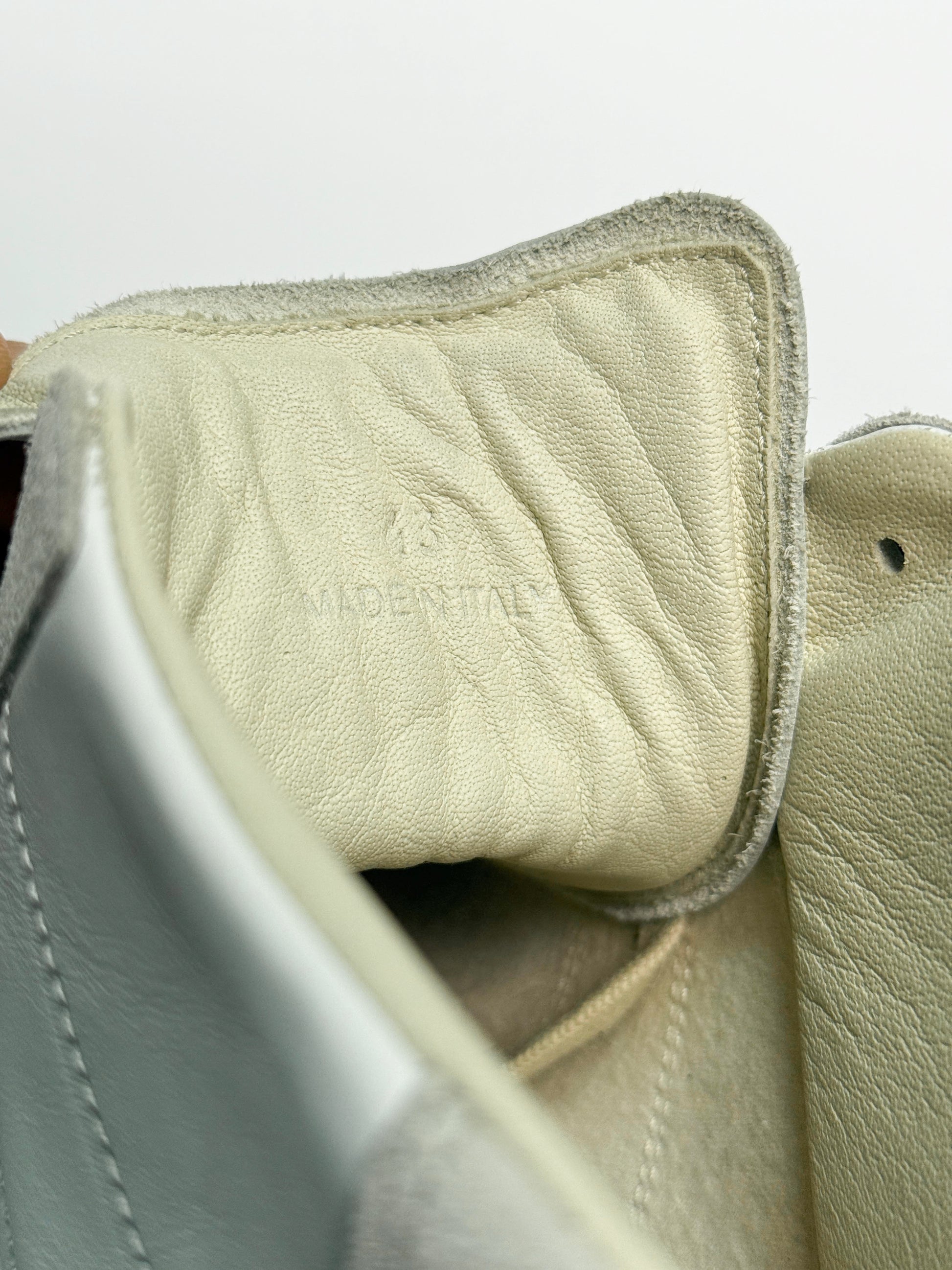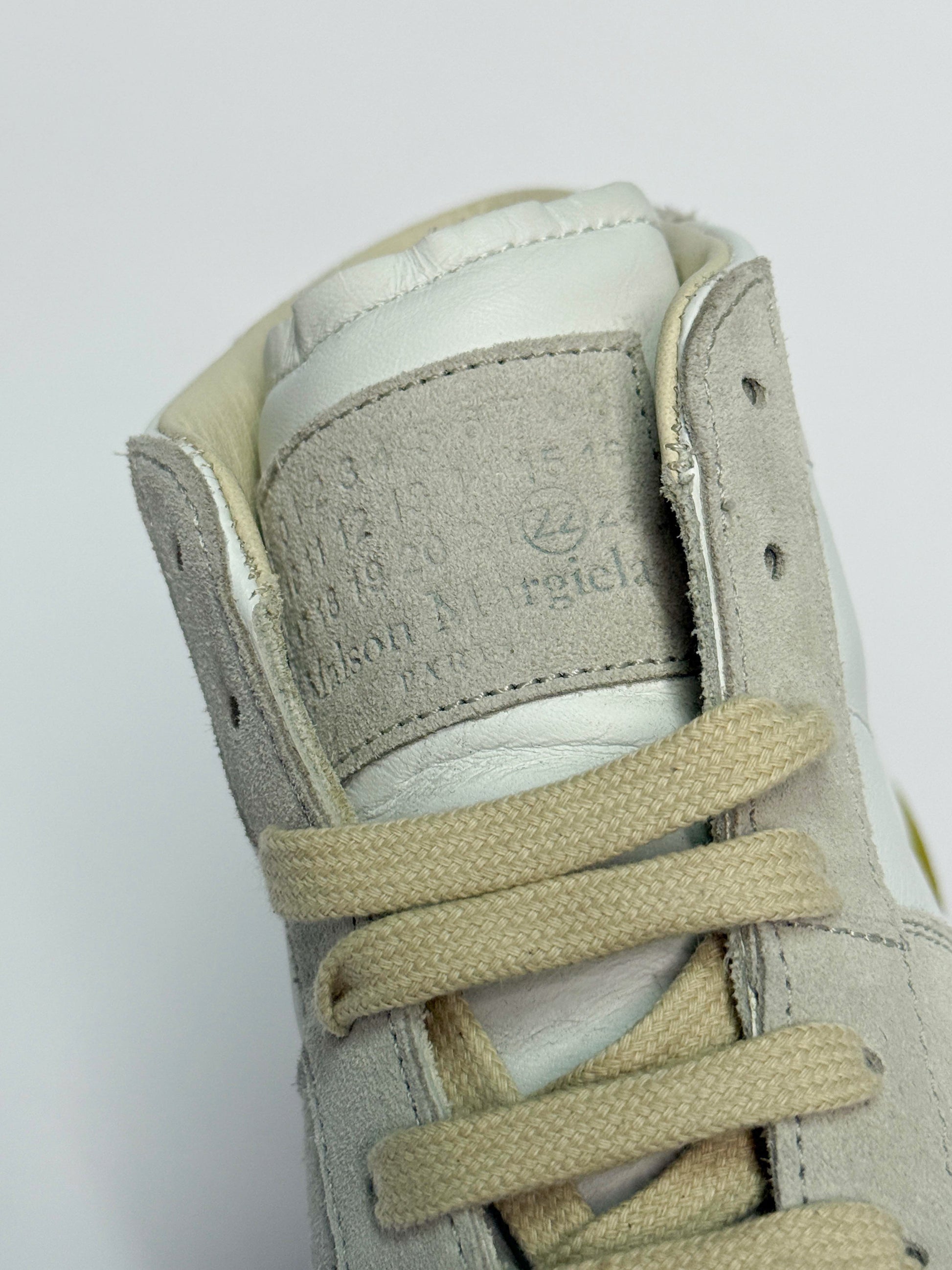 Hightop GATs from Margiela in the classic colorway with a cool twist being a fluorescent sole that can appear neon to dark green/brown depending on the light. Super rare pair from 2017. Comes with box and dustbags.