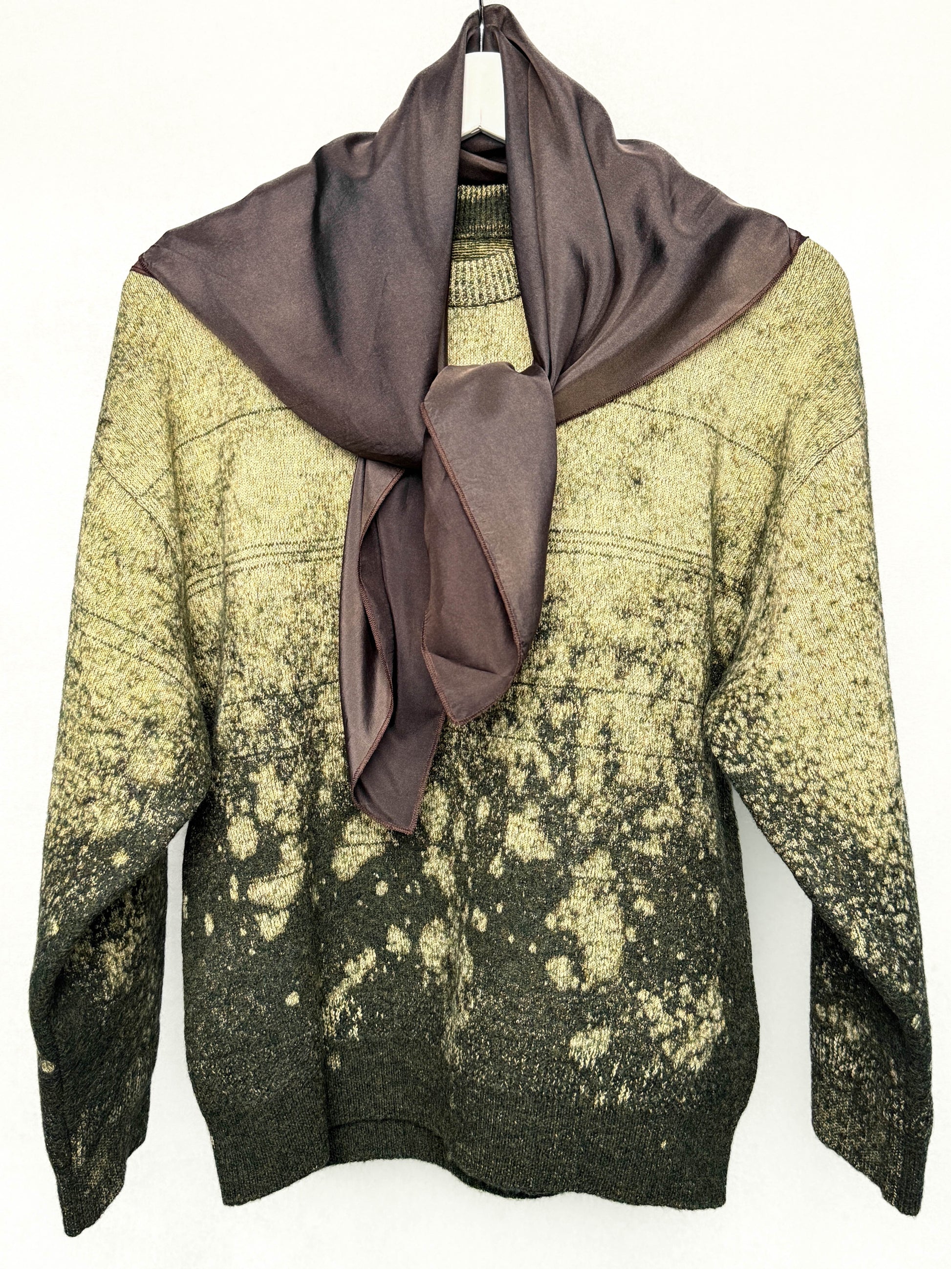 Maison Margiela’s takes the everyday knit into artisanal territory. Crafted from a premium wool-cotton blend, featuring a striking bleach-effect gradient pattern and a built-in satin scarf detail in a brown hue. A stunning piece that plays with texture, layering, and color. Originally retailed at 1200€.